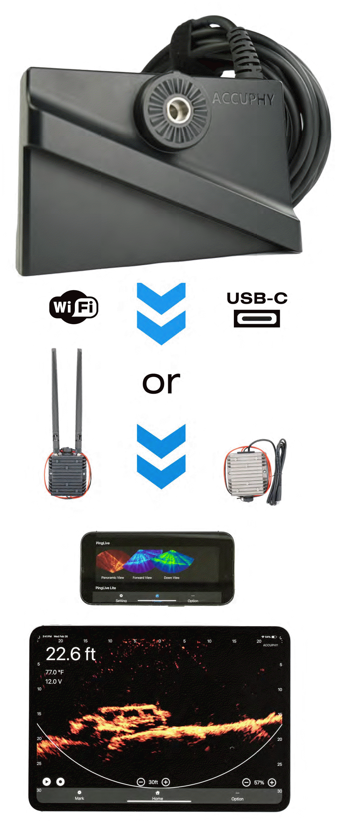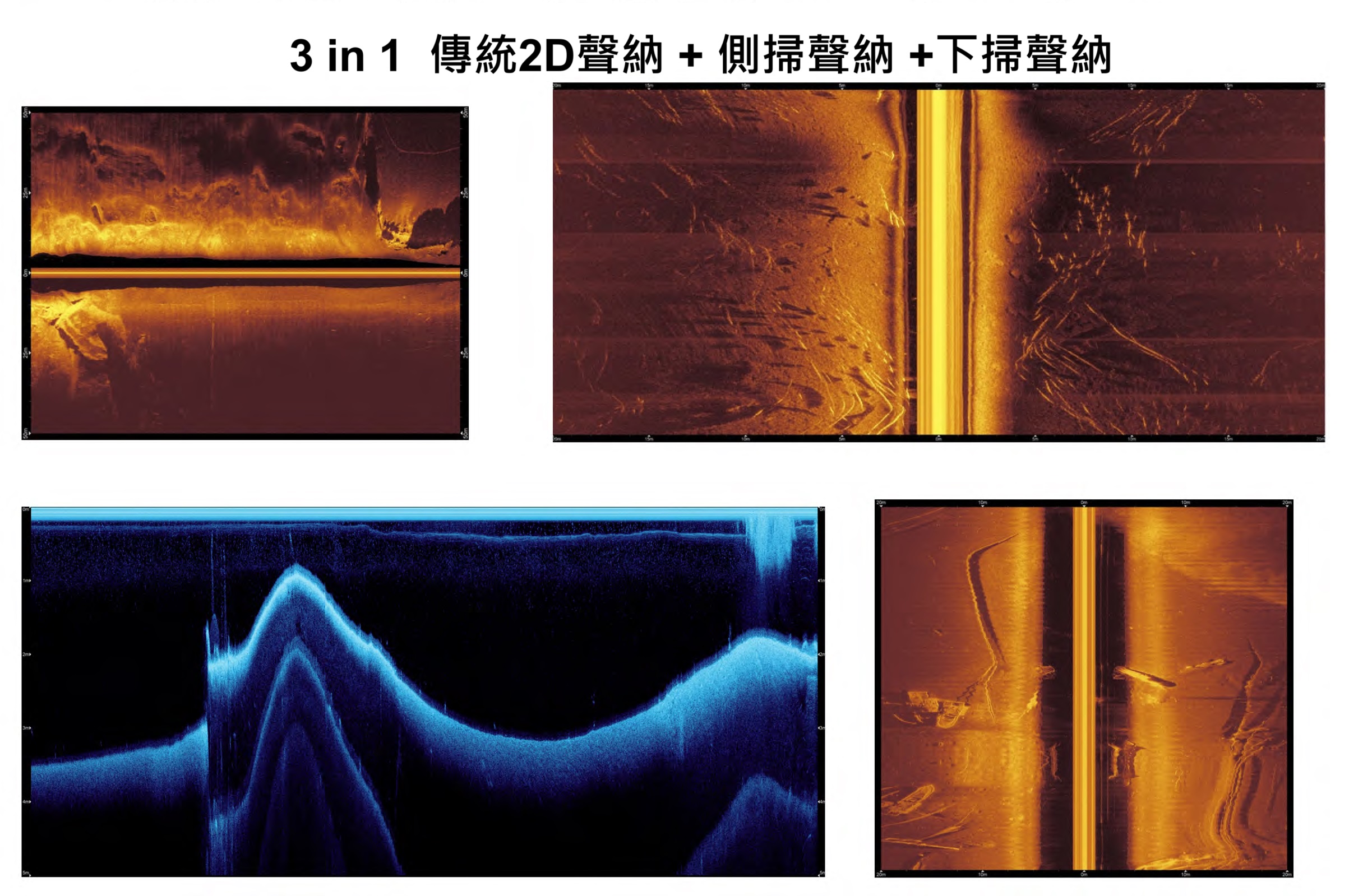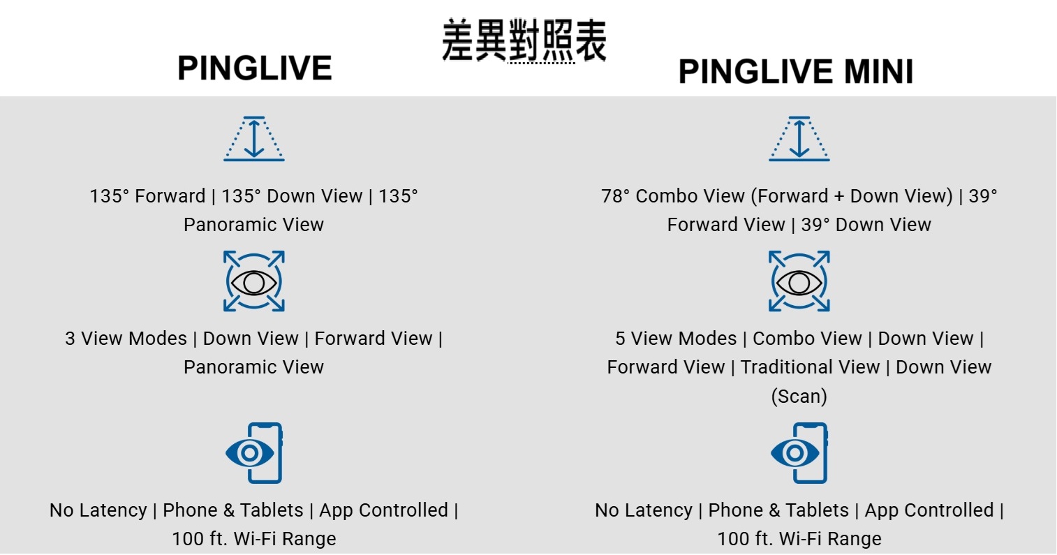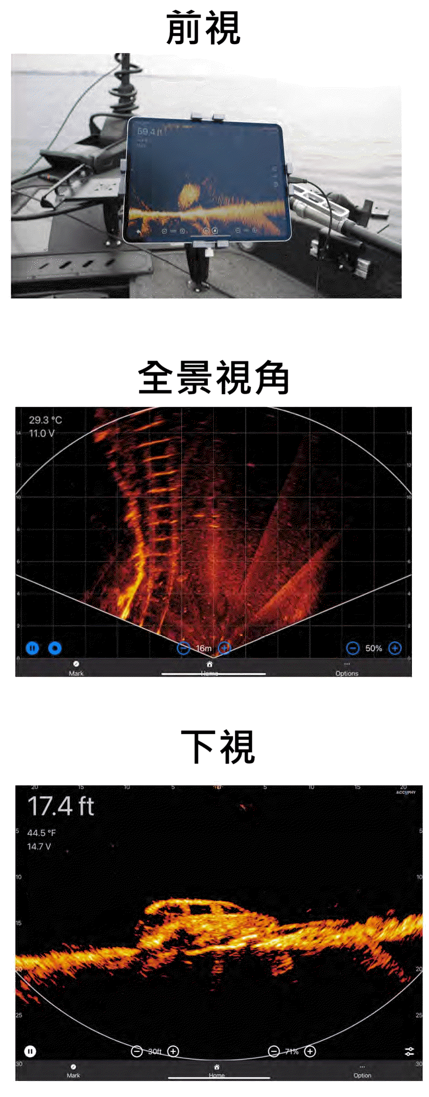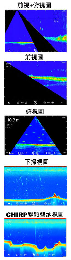 無線動態聲納 | 即時成像 | 全景視角 | 向前視角 | 向下視角