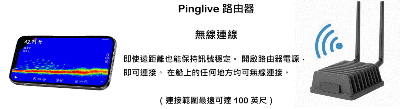 PingLive Sonar 動態聲納 優秀的成像效果 創新的無線LiveSonar系統,透過Wi-Fi連線手機或平板電腦作為顯示器。換能器配備整合處理器,無需單獨的黑盒子, 比傳統系統線纜減少 50%。透過內建 Wi-Fi 路由器,換能器將聲納資料傳到螢幕,只需極少設定即可提供清晰、即時的水下視覺效果。 即插即用-透過WiFi連接到您的手機或平板電腦。 * 全景視野: 可掃描大面積區域,輕鬆發現物體和魚群. * 俯視 : 135°視角觀察船底下方活動. * 前視 : 覆蓋前方水域各種釣場景像. 規格: 探頭